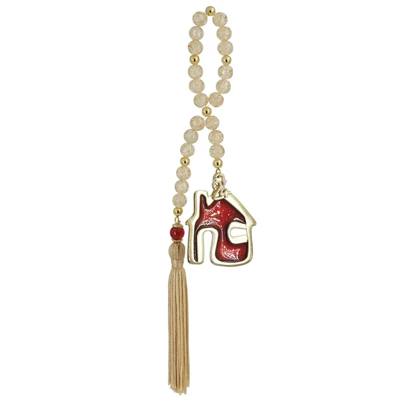 - COLORS: BEADS-BEIGE, ELEMENT-RED/GOLD, TUFT-CREAM